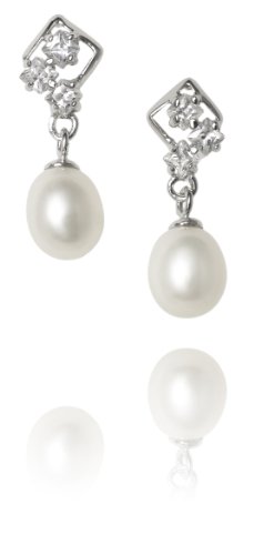 Beautiful oval cultured freshwater pearl earrings accented with sparkling cubic zirconias. These sterling silver earrings are exquisite and intricate and create a delicate yet glittering impression.