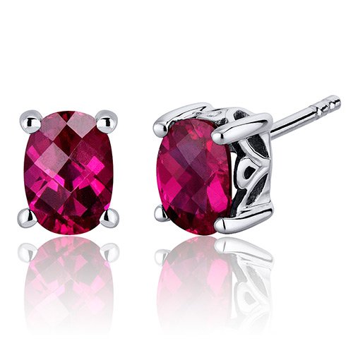 Center Stone: 2 Pieces Lab Created Ruby, Oval Cut With Checker Board Top 7 x 5 mm, 2.00 carats total weight, Pigeon Blood Red Hue with Brilliant Sparkle. Earrings: 2.30 grams, Pure Sterling Silver with .925 stamp, Earrings feature Stud posts with Bullet backs, exceptional Design, Craftsmanship and Rhodium finishing. Perfect gift for Mothers Day, Birthdays, Valentines Day, Graduation, Christmas or just about any other occasion. Money Back Guarantee. Includes a Signature Gift Box , style PER-SE7970