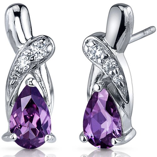 Center Stone: 2 Pieces Lab Created Alexandrite, Pear Shape 8 x 5 mm, 2.00 carats total weight, Changes Hue depending on lighting: Deep Pink, Dark Purple, Rich Blue, and Ocean Teal, Brilliant Sparkle. Side Stones: 6 Pieces Super Sparkling Machine Cut White Cubic Zirconia. Earrings: 3.60 grams, Pure Sterling Silver with .925 stamp, Earrings feature Stud posts with Bullet backs, exceptional Design, Craftsmanship and Rhodium finishing. Perfect gift for Mothers Day, Birthdays, Valentines Day, Graduation, Christmas or just about any other occasion. Money Back Guarantee. Includes a Signature Gift Box , style PER-SE7436