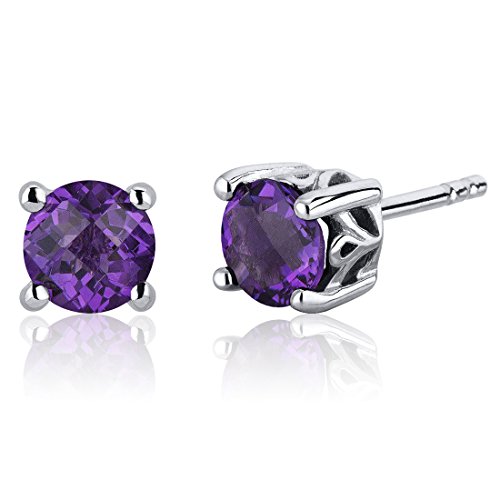 Center Stone: 2 Pieces Genuine Amethyst, Round Cut with Checker Board Top 6 mm Diameter, 1.50 carats total weight, Royal Purple Hue with Brilliant Sparkle. Earrings: 2.50 grams, Pure Sterling Silver with .925 stamp, Earrings feature Stud posts with Bullet backs, exceptional Design, Craftsmanship and Rhodium finishing. Perfect gift for Mothers Day, Birthdays, Valentines Day, Graduation, Christmas or just about any other occasion. Money Back Guarantee. Includes a Signature Gift Box , style PER-SE7942